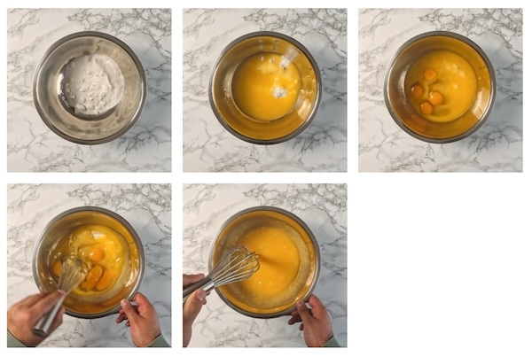 - Into a mixing bowl whisk together caster sugar, melted butter, whole eggs & vanilla paste until completely emulsified.