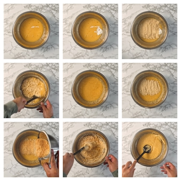 - Switch to a spatula and fold in salt, baking powder and half of the ground almond. Once combined, fold in the remaining ground almonds and the cooled desiccated coconut.