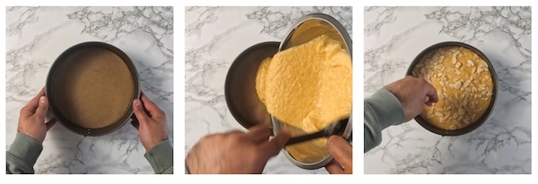- Pour the cake batter into the prepared cake tin and evenly distribute almond flakes over the surface of the cake batter. Bake in the preheat oven for 35-45 minutes, until golden brown and a toothpick inserting into the centre comes out clean.