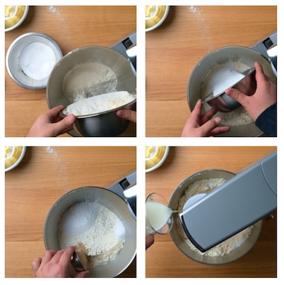 - In a stand mixer bowl fitted with the dough hook, combine the flour, sugar, salt, and instant yeast. Start the mixer on low speed and slowly stream in the warm milk and egg, mixing until a shaggy dough begins to form.