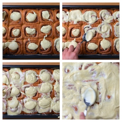 - Remove the rolls from the oven and cool for 5 minutes. Spoon over ⅓ of the frosting while the rolls are hot so it seeps into the spirals. After a further 15 minutes, apply the remaining frosting for a thick, velvety finish. Allow to cool slightly before serving.