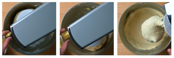 - With the mixer still on low, gradually feed the butter into the dough, piece by piece. Once the butter is incorporated, increase the speed to medium and knead for 4 minutes until the butter has completely dissolved into the gluten structure.