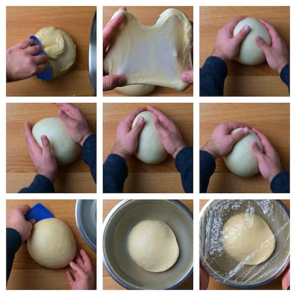 - Turn the dough out onto a clean work surface. Perform a few "slap and folds" to build final surface tension, then let the dough rest for 5 minutes. Shape into a smooth ball and place into a greased bowl. Cover with a shower cap or cling film and transfer to the fridge for a cold proof of 12 to 24 hours (18 hours is ideal) to develop flavour and make the dough easier to handle.