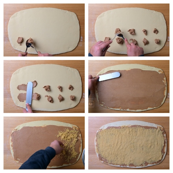 - Dollop the cinnamon butter over the dough and spread evenly with a palette knife, leaving a 1cm bare border along one long edge to seal. Evenly sprinkle the light brown sugar over the butter.
