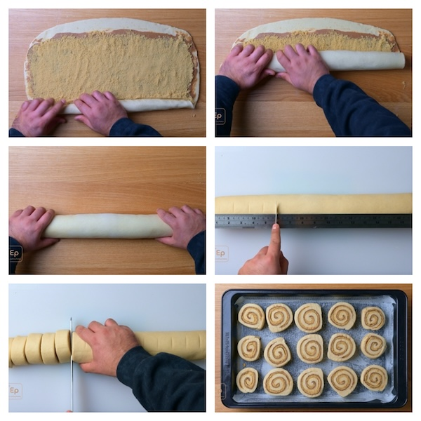 - Tightly roll the dough into a log. Trim the uneven ends, then mark the log at 3cm intervals. Use a sharp serrated knife to cut the rolls and arrange them on a lined baking tray.