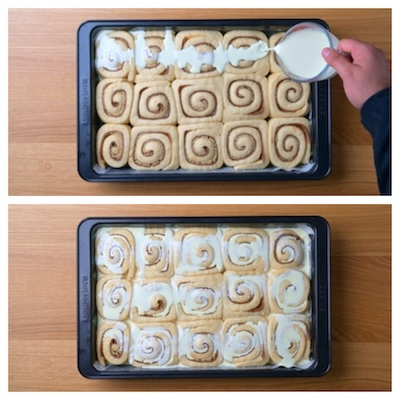 - Preheat your oven to 160°C (320℉). Just before loading into the oven, pour the room-temperature cream over the proved rolls, this creates the signature "bakery-style" gooey texture. Bake for 25–30 minutes until lightly golden.