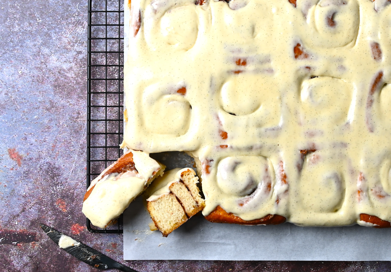 - While the rolls bake, cream together the cream cheese and butter until fluffy. Gradually add the icing sugar and vanilla paste until smooth.