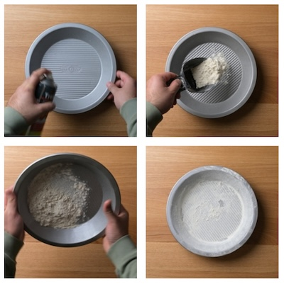- Lightly grease the pie tin with butter or cooking spray. Dust with flour, shaking the tin to coat the base and sides evenly, then tap out the excess onto your work surface.