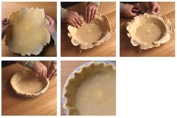 - Using kitchen scissors or a sharp knife, trim the pastry to leave a 1cm overhang, then tuck this excess under itself along the rim of the tin. To crimp the crust, use the index finger of one hand to push the pastry from the inside between the thumb and index finger of your other hand on the outside. Repeat this around the entire circumference.