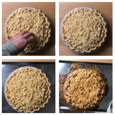 - Evenly sprinkle the streusel over the apple filling, ensuring the fruit is well covered. Place the pie onto a baking tray—this will catch any caramel that bubbles over—and bake for 45–55 minutes until the topping is a deep golden brown and the filling is bubbling.
