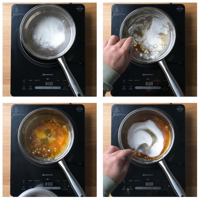 - Into a clean saucepan, make a dry caramel. Place the pan on a low-medium heat, add in about a ¼ to ⅓ of the sugar, just enough to make a thin layer to cover the base of the pan. At this point do not mix the sugar, leave it to melt on it own.Once to start to see parts of the sugar start to caramelise you can start mixing gently by bringing the sugar from the outside of the pan to the centre. Once all the sugar has caramelised sprinkle in the next portion and gently stir in to the caramel, repeating the process until all the sugar has been added in and caramelised.2