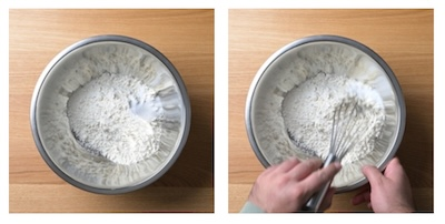 - Into a large mixing bowl add in flour, sugar and salt. Give it a quick whisk to evenly distribute the sugar and salt.
