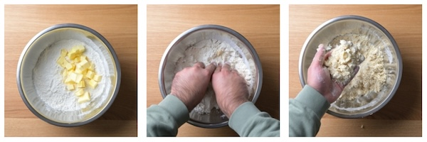 - Next add in the cold, cubed butter. Rub the butter into the flour until the flour start to resemble a sandy texture. (You should still have clumps of butter)