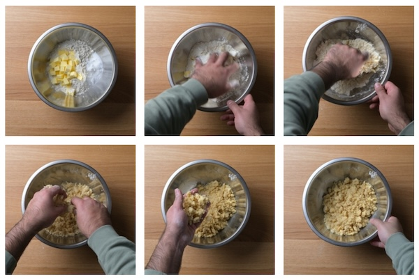 - Add all the ingredient into a mixing bowl and rub the butter into the flour, as you get to the sandy texture like withe pie dough you can start to mixing a little more aggressively. Keep this going until a dough starts to form. Stop mixing once you get to a point where dough crumbles when lightly rubbed with your fingers. By hand this will take 3-4 minutes. Keep covered in the fridge to chill and set firm until it comes time to bake.