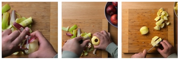 - Start by peeling and coring all the apples. The dice them into 2-3 cm pieces, I normally cut the apples into quarters and the cut each quarter into 4-6 pieces depending on the size of the apple.