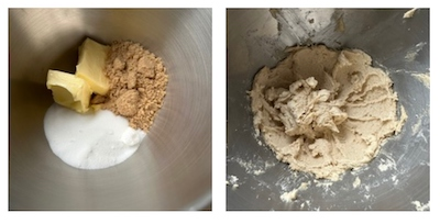 - Into a stand mixer fitted with a paddle attachment, cream together butter, caster sugar and light brown sugar on a medium-high speed. Scrape down the bowl every so often until it is light and pale.
