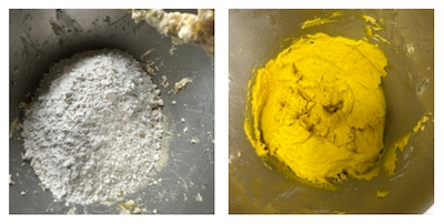 - Sift together flour, baking powder, bicarbonate of soda and yellow colour.