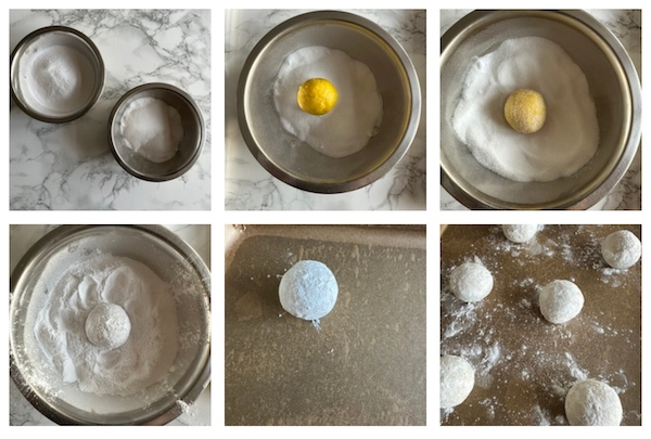- Grease and line the baking trays with paper, fill icing sugar and caster sugar into separate bowls. Take the dough balls out of the freezer and roll into caster sugar and then icing sugar and onto the baking tray. Repeat for all dough balls.