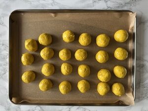 - Portion and roll the cookie dough into 20-30g balls and place onto a line tray, straight into the freezer for 30 minutes or fridge for 1 hour. Preheat the oven to 160℃ (320℉).