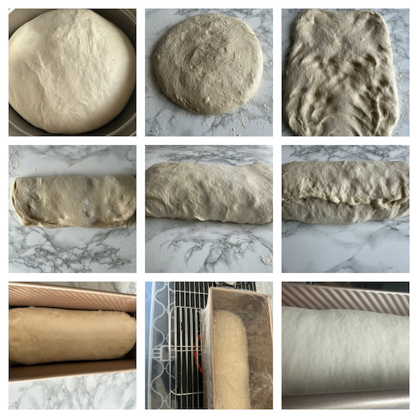 - Lightly grease the loaf tin.Turn the dough out onto a light floured work surface so the top of the dough is at the bottom (refrain from punching the air out). Gently stretch the dough into a vertical rectangle 30cm x 40cm (11in x 15in). From the top-down, roll the dough tucking it in on itself with your thumbs. Pinch the ends and side where the dough meets to seal and place into the loaf tin seam side down, cover with cling film and back into the prover for 30 minutes. (The dough should rise to about 80% of the tin height)