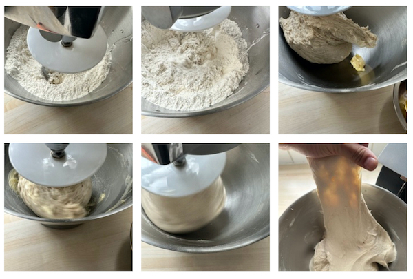 - Set on the mixer with a dough hook attachment and start mixing on a low-medium speed. Slowly pour the water into the mixer until a rough dough has formed. Scrape down the bowl and mix for 2 minutes on a medium speed. (We just want to activate the gluten before adding in fats).Add the butter in a tablespoon at a time, allowing it to incorporate before adding more. Once it is all combined, turn the mixer up to high and mix for 5-7 minutes. You are looking for a smooth, elastic dough (window pane).