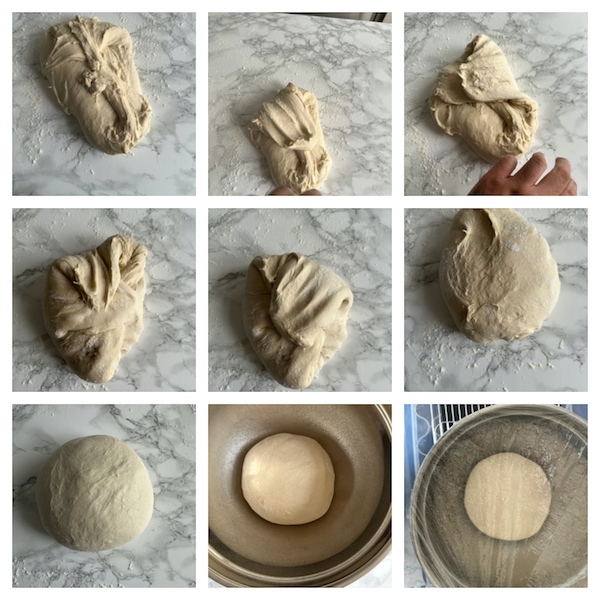 - Lightly flour your work surface and turn the dough out. Pinch a corner of the dough, stretch outwards and fold over onto itself to the centre of the dough. Continue to do this working your way around the dough to form a rough ball. With your dough scraper scoop up the dough and turn over. Use the dough scraper to roll and tuck the dough to form a smooth and tight ball. Place into a lightly greased bowl and cover with cling film (or shower cap) then into the prover for 50 minutes - 1 hour or doubled in size.