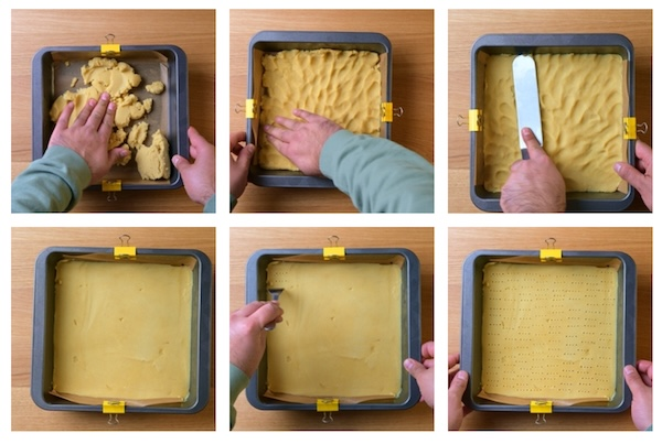 3. Press the dough into the tin spreading to the corners. Once spread as evenly as possible run a palette knife over the top to smooth and level the dough. Pierce the dough with a fork and place the tin in the fridge for 30 minutes.