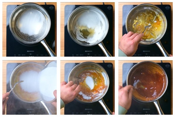 Once to start to see parts of the sugar start to caramelise you can start mixing gently by bringing the sugar from the outside of the pan to the centre. Once all the sugar has caramelised sprinkle in the next portion and gently stir in to the caramel, repeating the process until all the sugar has been added in and caramelised.