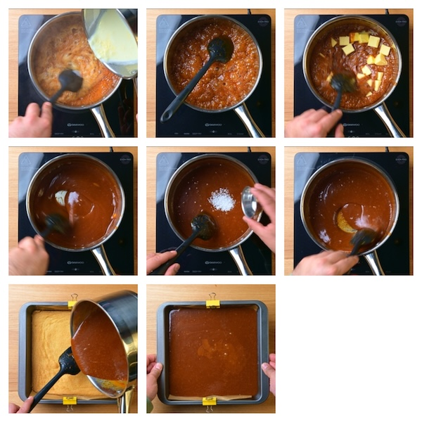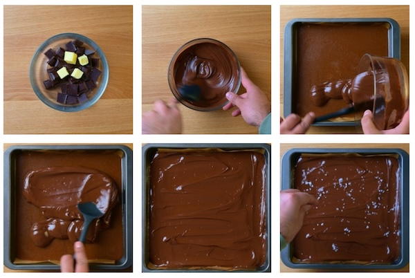 2. Pour over the set caramel and using the back of a spoon spread to the corners of the tin until evenly distributed and finish with a generous helping of flakey sea salt.
