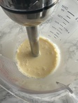 6. You want a tall jug so that the head of the stick blender stays submerged to avoid too many air bubbles forming. Avoid moving the stick blender around to much, move up and down slowly without breaking the surface. You can do this by hand if you don't have a stick blender, a stick blender allows the fats to emulsify thoroughly so the mix does not split out.